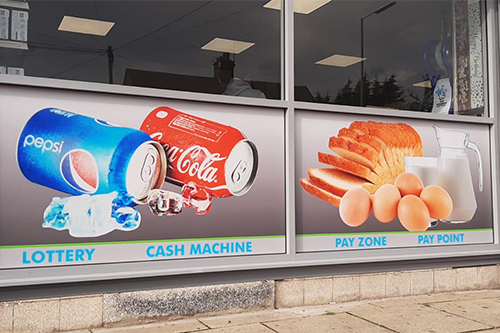 Cover your entire window in high quality full colour imagary. Not only do bring your products and services in to full view of potential passing trade but it is also a neat way to hide internal shelving and fittings.